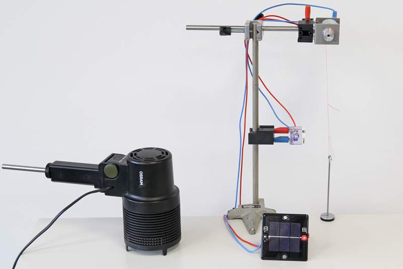 Zunächst wird mit der Ersatz-Sonne die Solarzelle bestrahlt. In der Folge setzt sich der Motor in Bewegung und das Wägestück wird angehoben - bis es den höchst möglichen Punkt erreicht. Nach Entfernung des Strahlers (Sonne), treibt die Fallbewegung des Wägestücks den Motor (als Generator) an und bringt die kleine blaue LED-Lampe zum Leuchten.