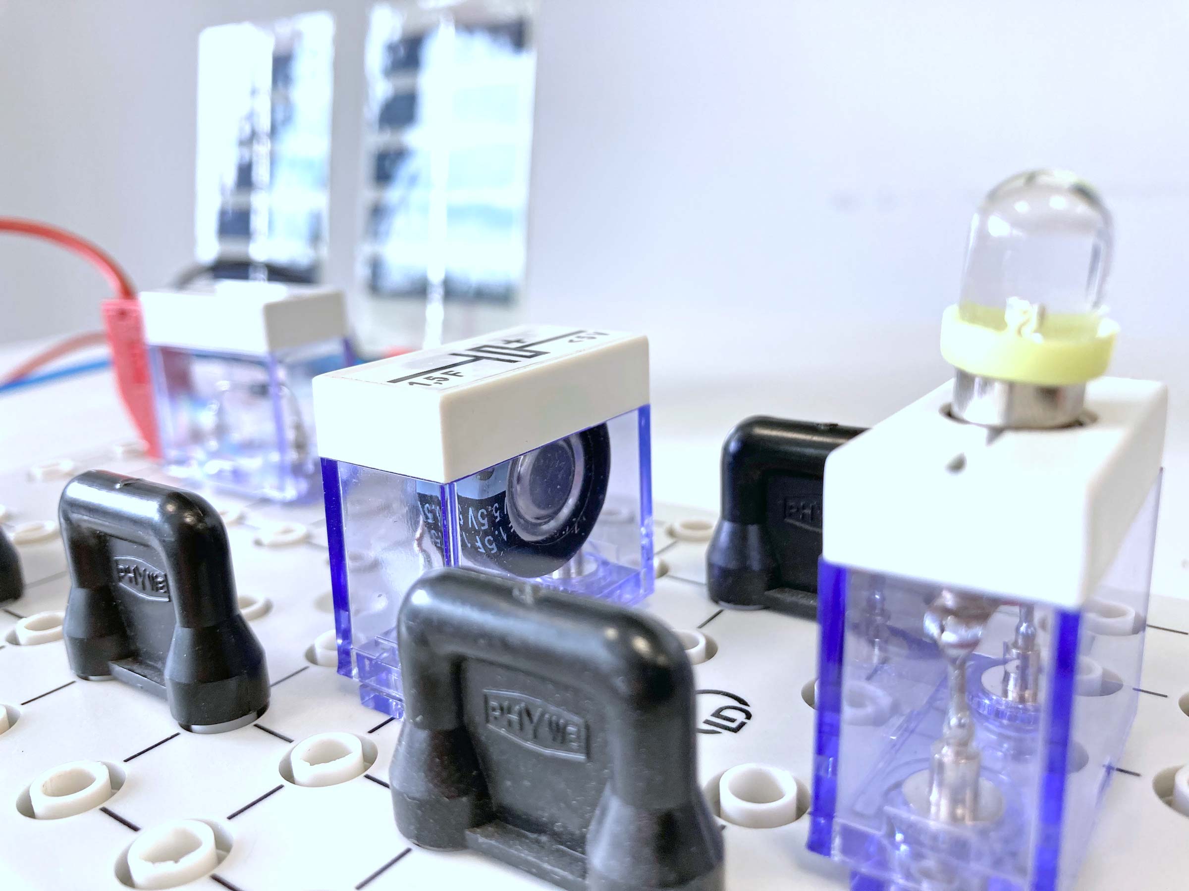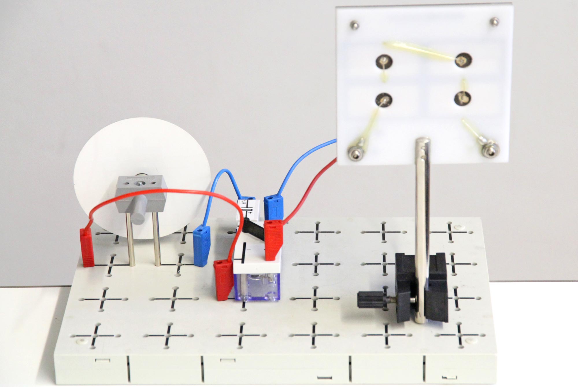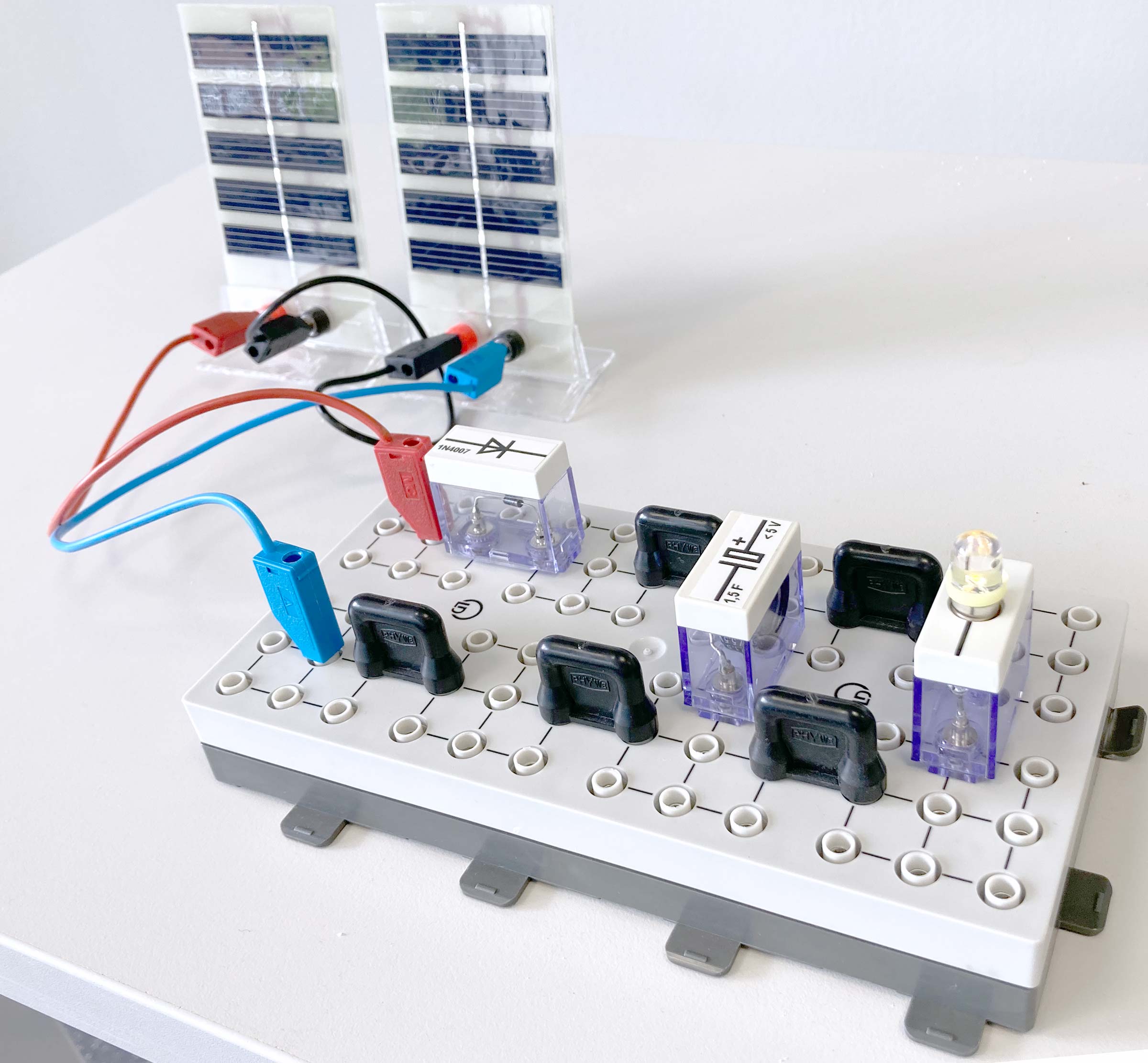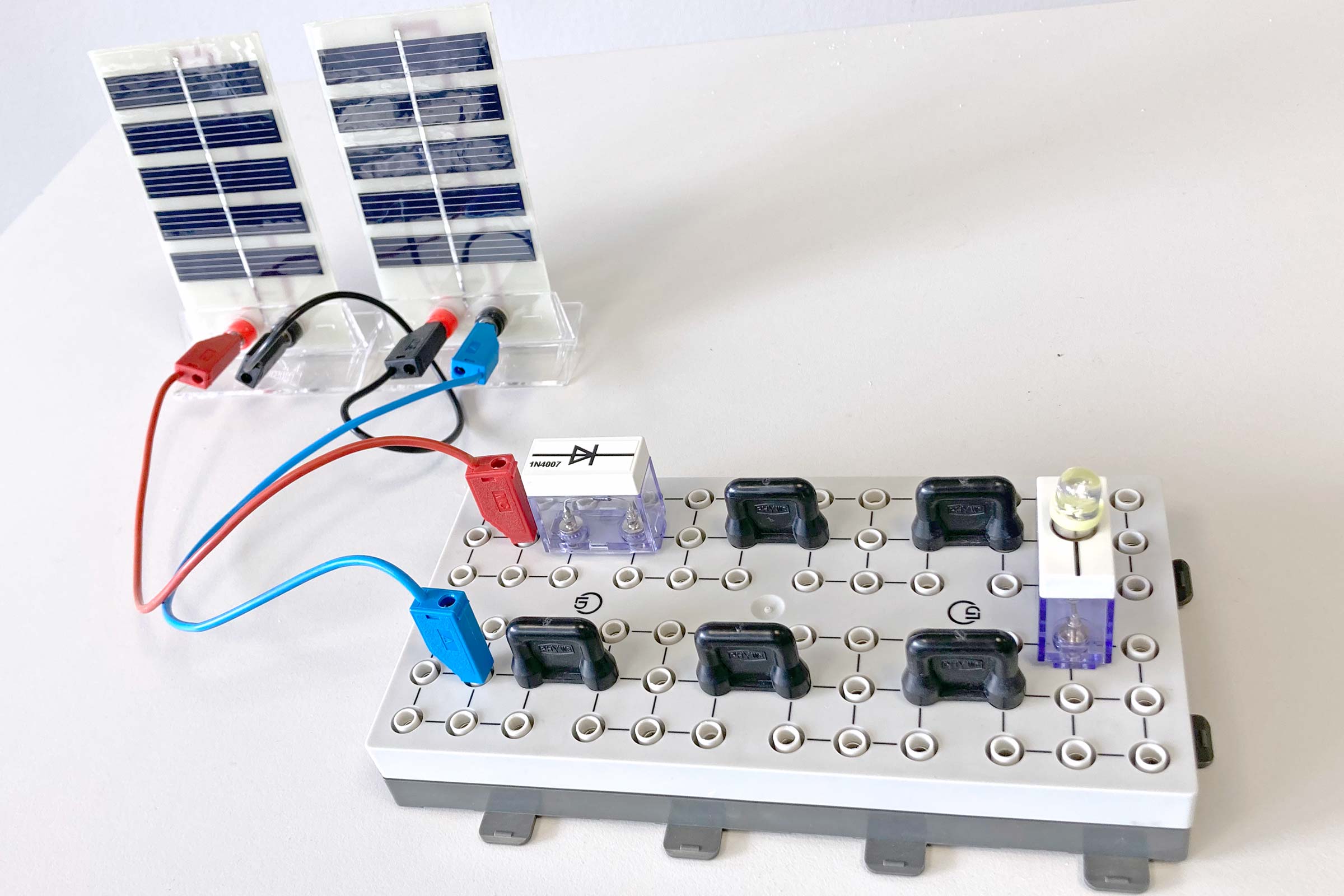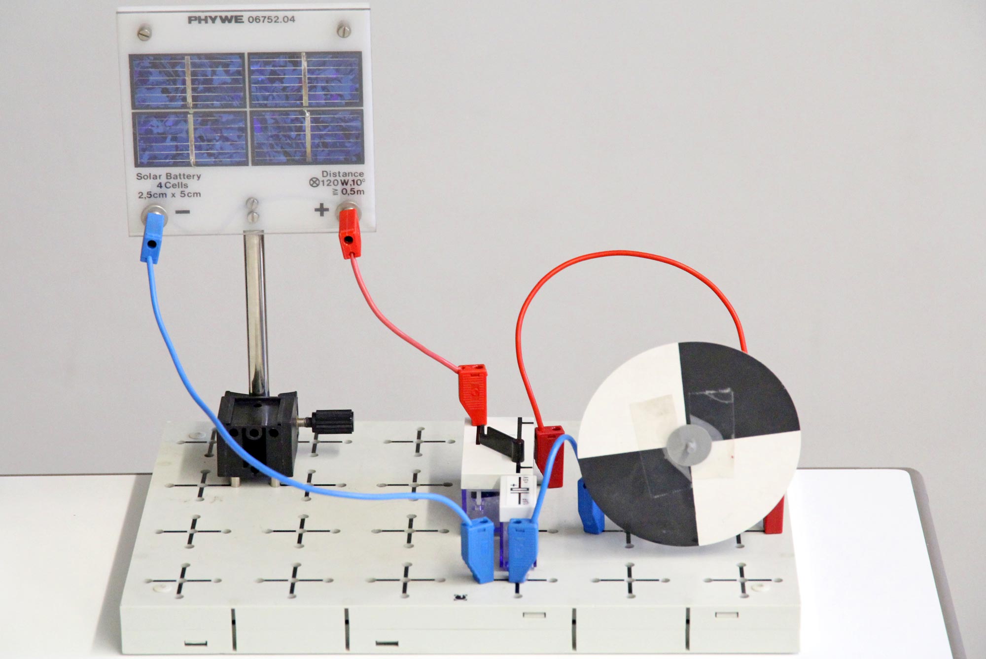 Versuchsaufbau. Erst wird der Kondensator über die Solarzelle geladen. Nach dem Umschalten wird die Energie an den Elektomotor abgegeben.