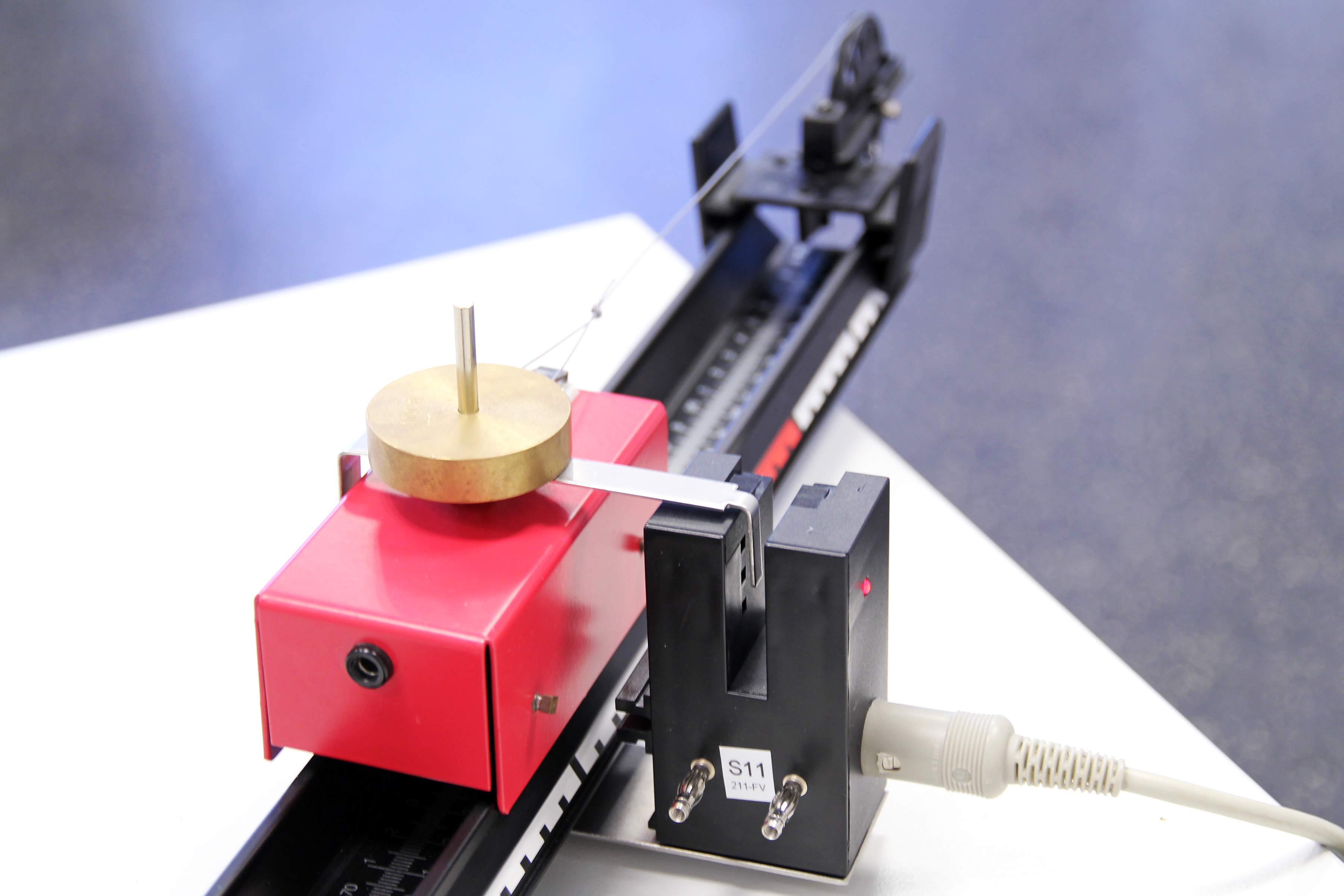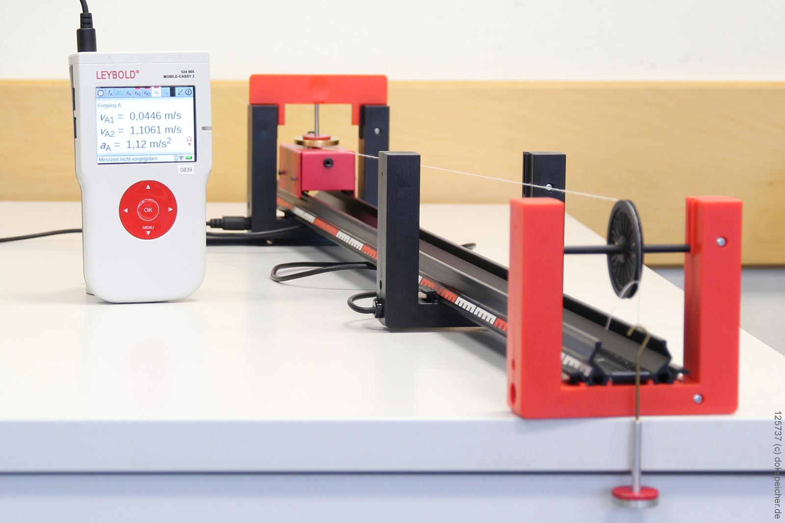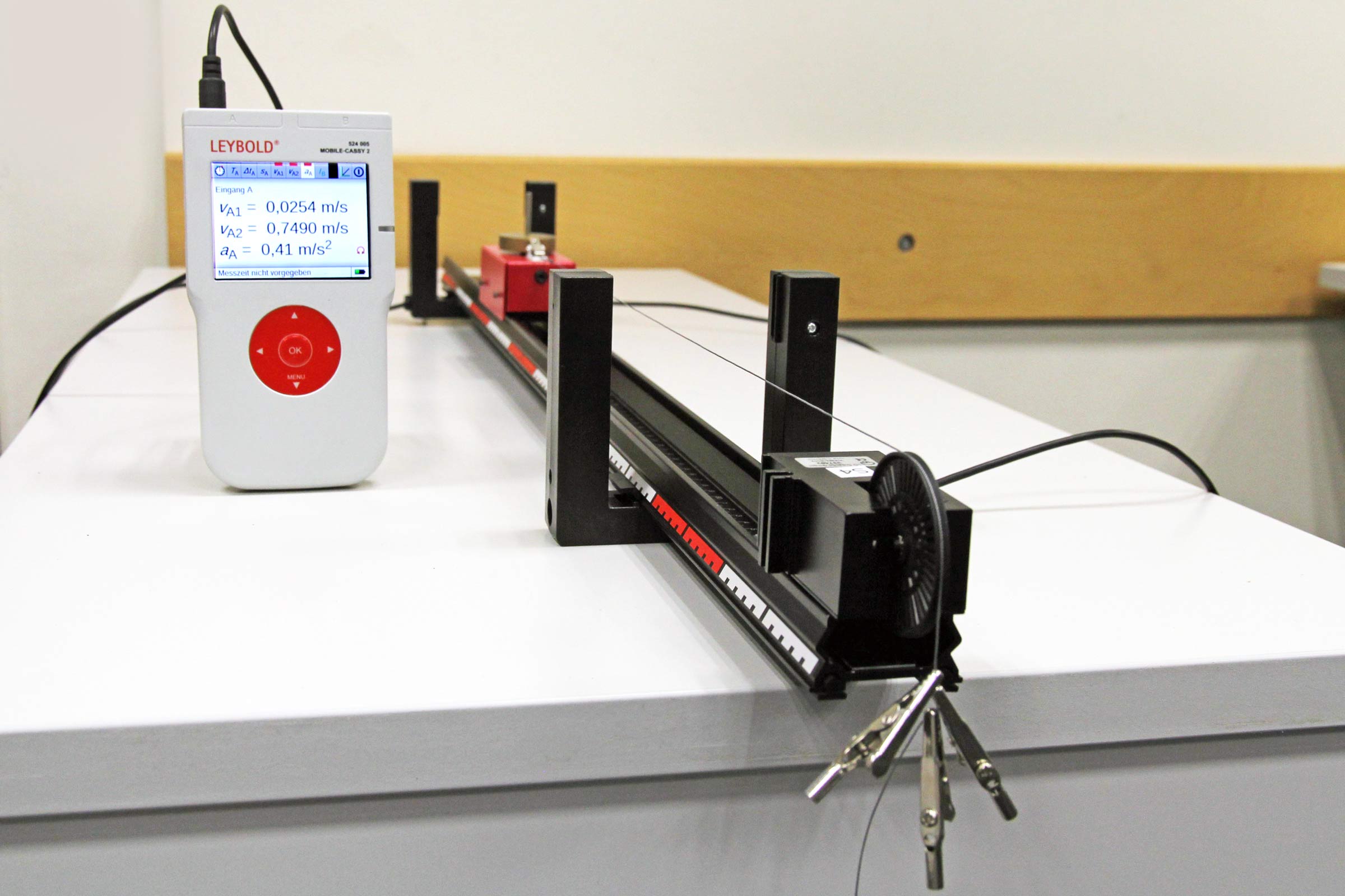 Der Aufbau erfolgt sehr ähnlich zur Vorlage von Leybold in den „ScienceLab“-Anleitungen (ME3) bzw. zum älteren Kasten MEC6. Ähnlich wie bei den weiter unten aufgeführten Versuchen wurde die Fahrbahn zum Ausgleich von Reibung leicht geneigt (ca. 0,5 cm auf 1 m).
