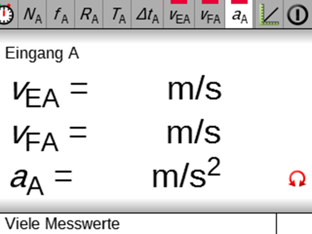 Messgröße a (Beschleunigung) im Mobile-Cassy-2 aktivieren. Automatisch wird die Geschwindigkeitsmessung für die Kombi-Lichtschranken aktiviert.