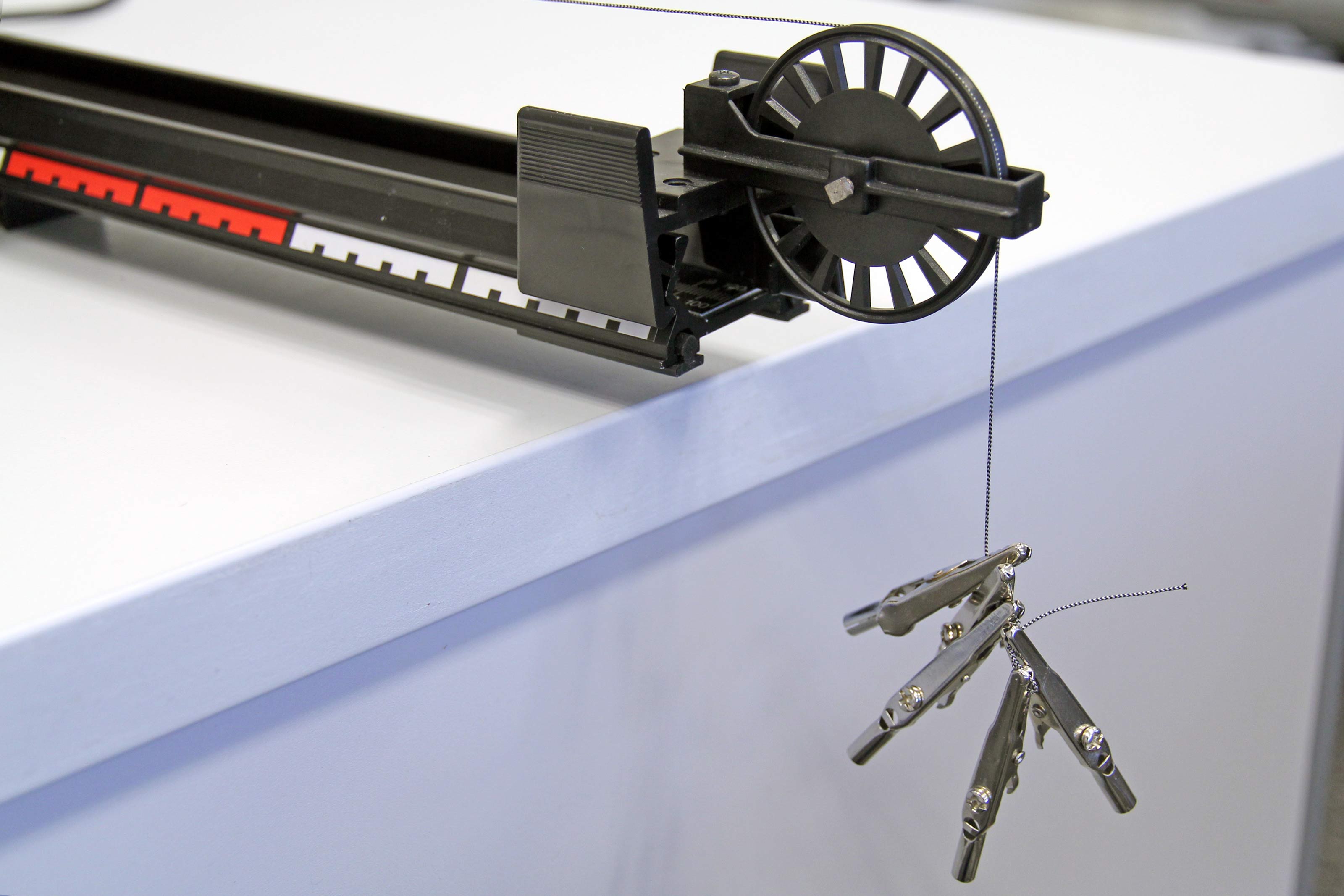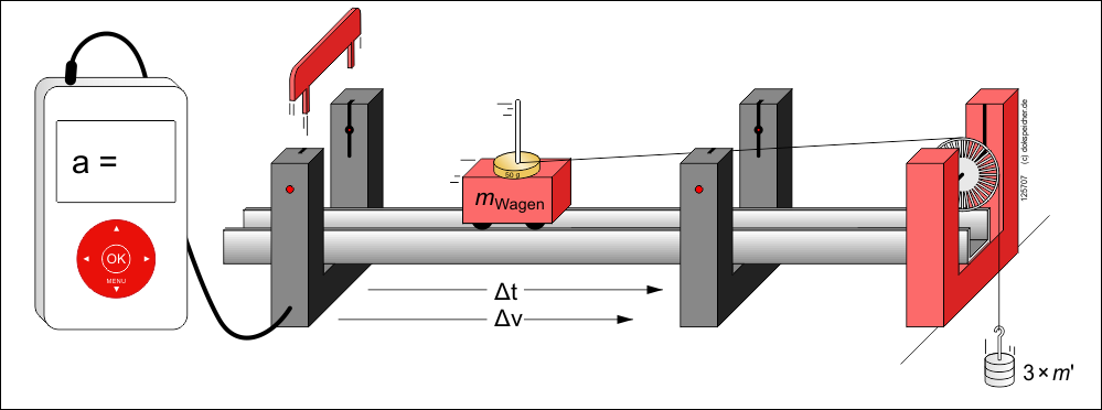 Anders als beim Demo-Versuch wird der Einfachheit halber die beschleunigte Masse nicht durch Umlagern der beschleunigenden Massen konstant gehalten.