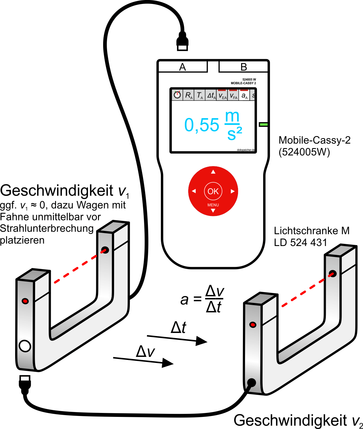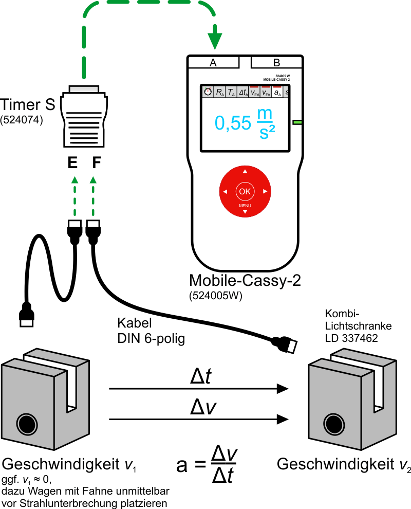 Messwagen kurz vor Unterbrechung des Strahls der ersten Lichtschranke platzieren. Nach dem Loslassen werden die Startgeschwindigkeit (ca. 0 m/s) und die Endgeschwindigkeit registiert und daraus die Durchschnittsbeschleunigung a berechnet.