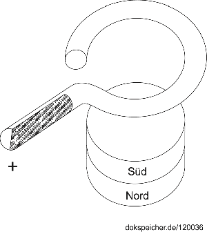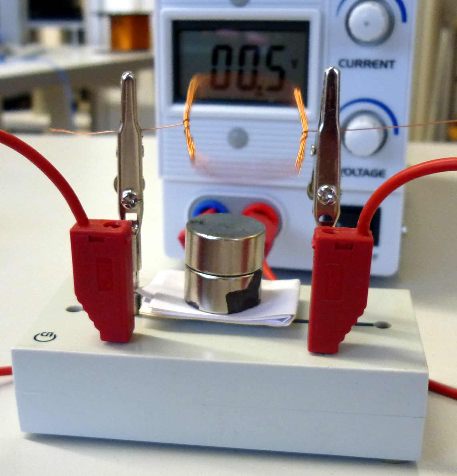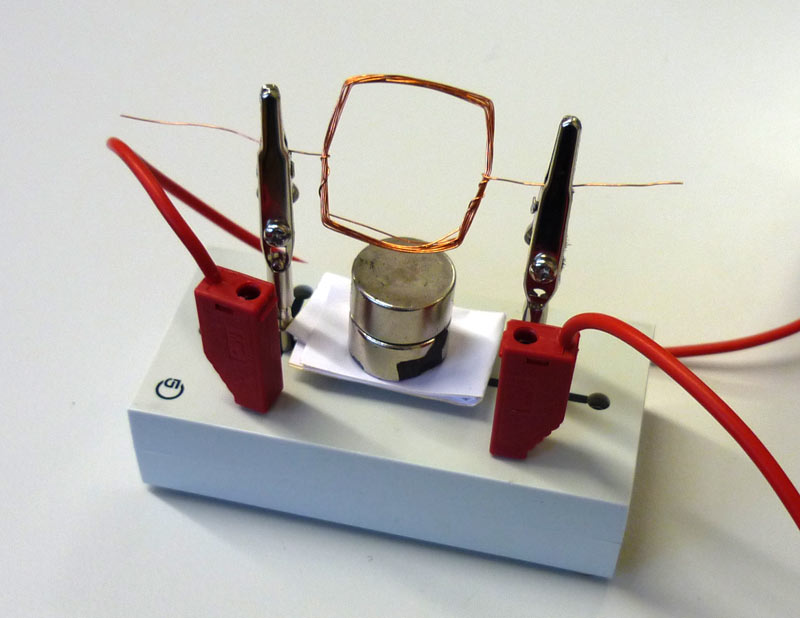 Unter den beiden Magneten stecken Schrauben in der Rastesteckplatte, um die Magnete zu fixieren. Das Papier verhindert einen Kurzschluss durch die Magneten. Die Spule wurde aus 1 m Kuperlackdraht (Durchmesser 0,3 mm) gewickelt, die Kantenlänge beträgt ca. 3 cm. Ein Drahtende ist komplett abisoliert, am anderen Ende nur die halbe Oberfläche.