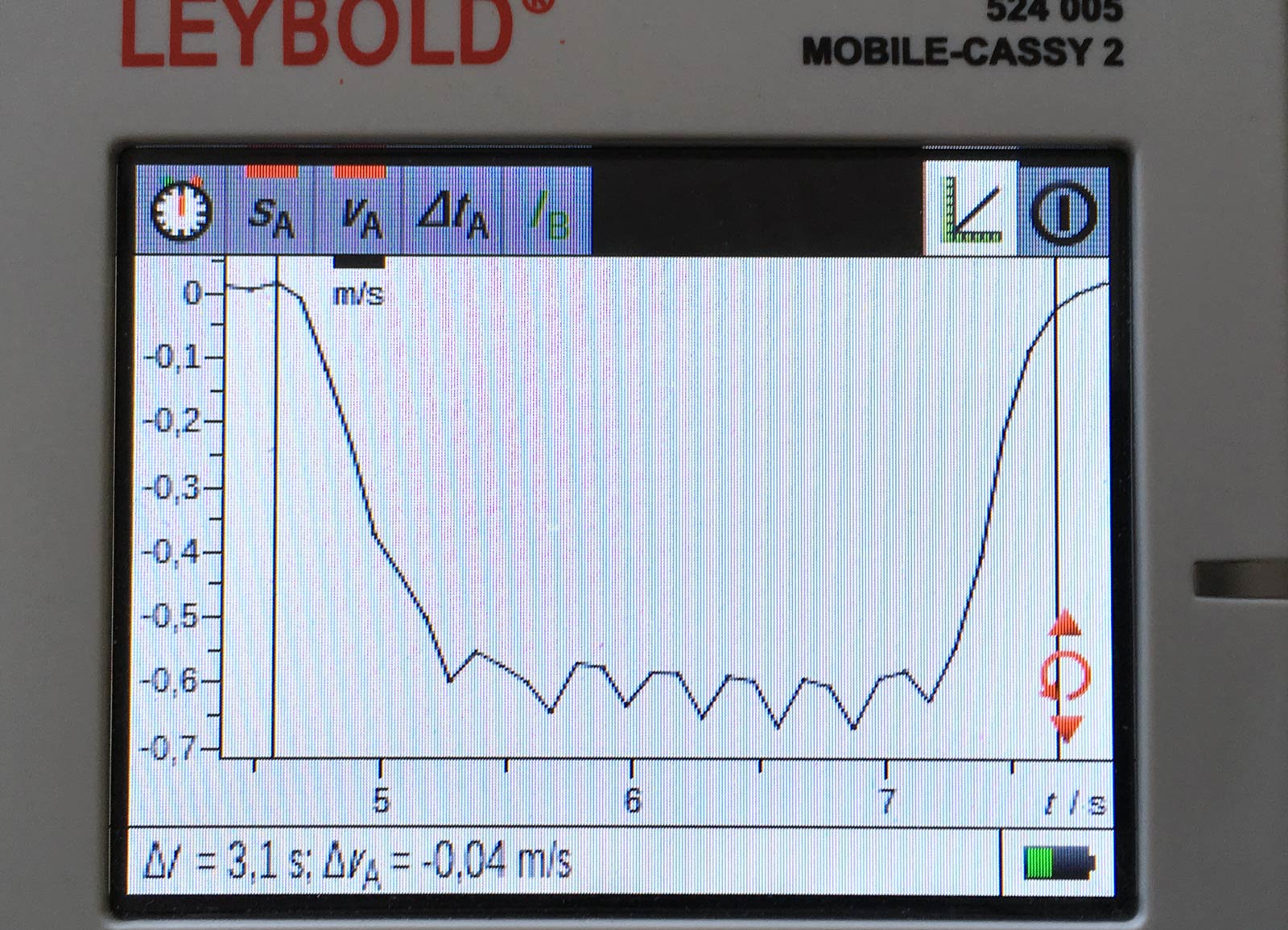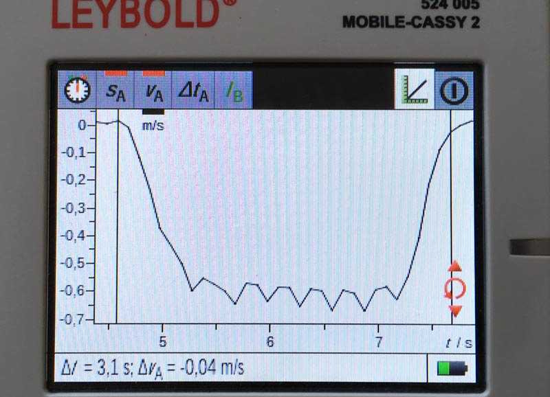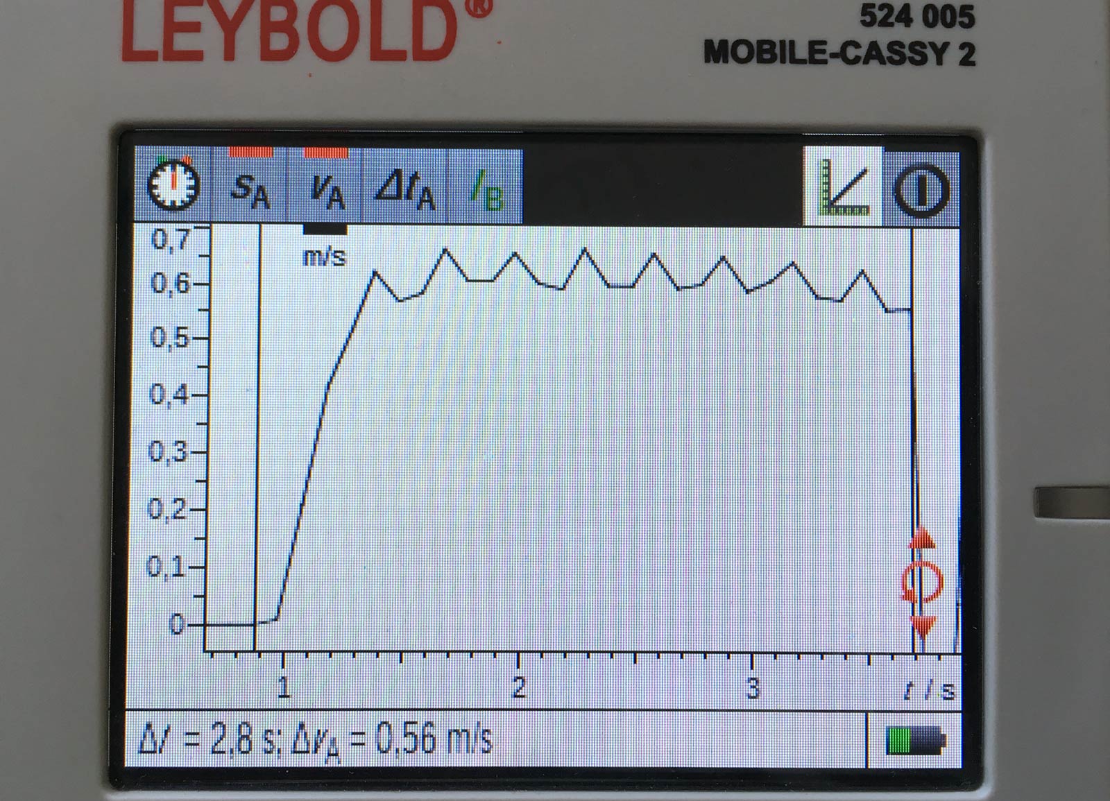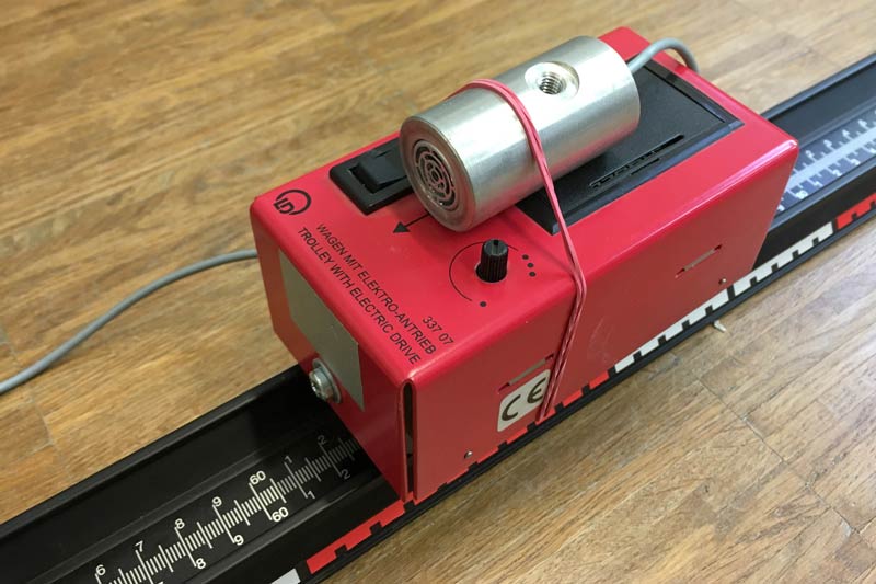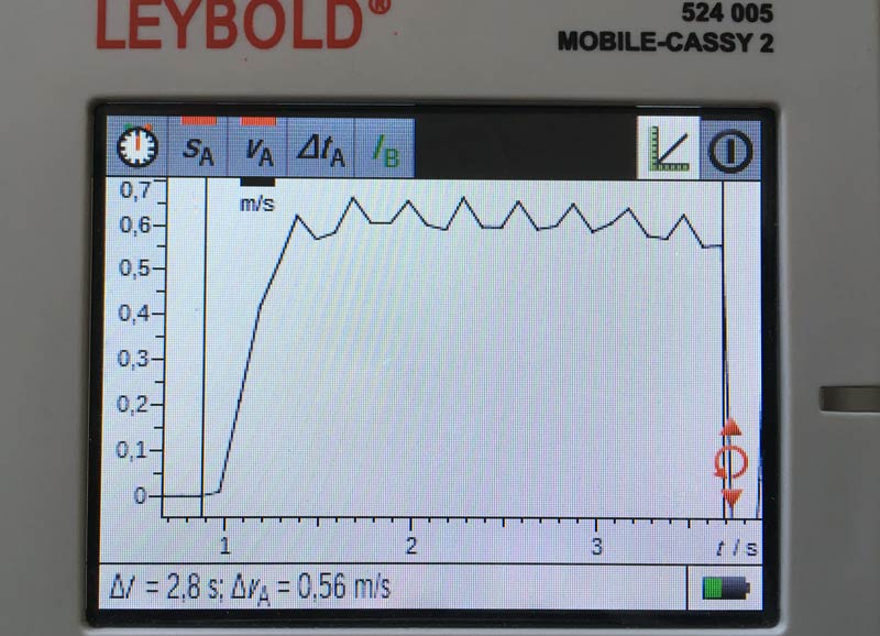 Die Messung der Geschwindigkeit des Wagens kann mit dem Laserbewegungssensor (LD 524073) erfolgen - oder auch sehr einfach mit Handstoppuhren auf einer Fahrstrecke von z.B. 1 m.