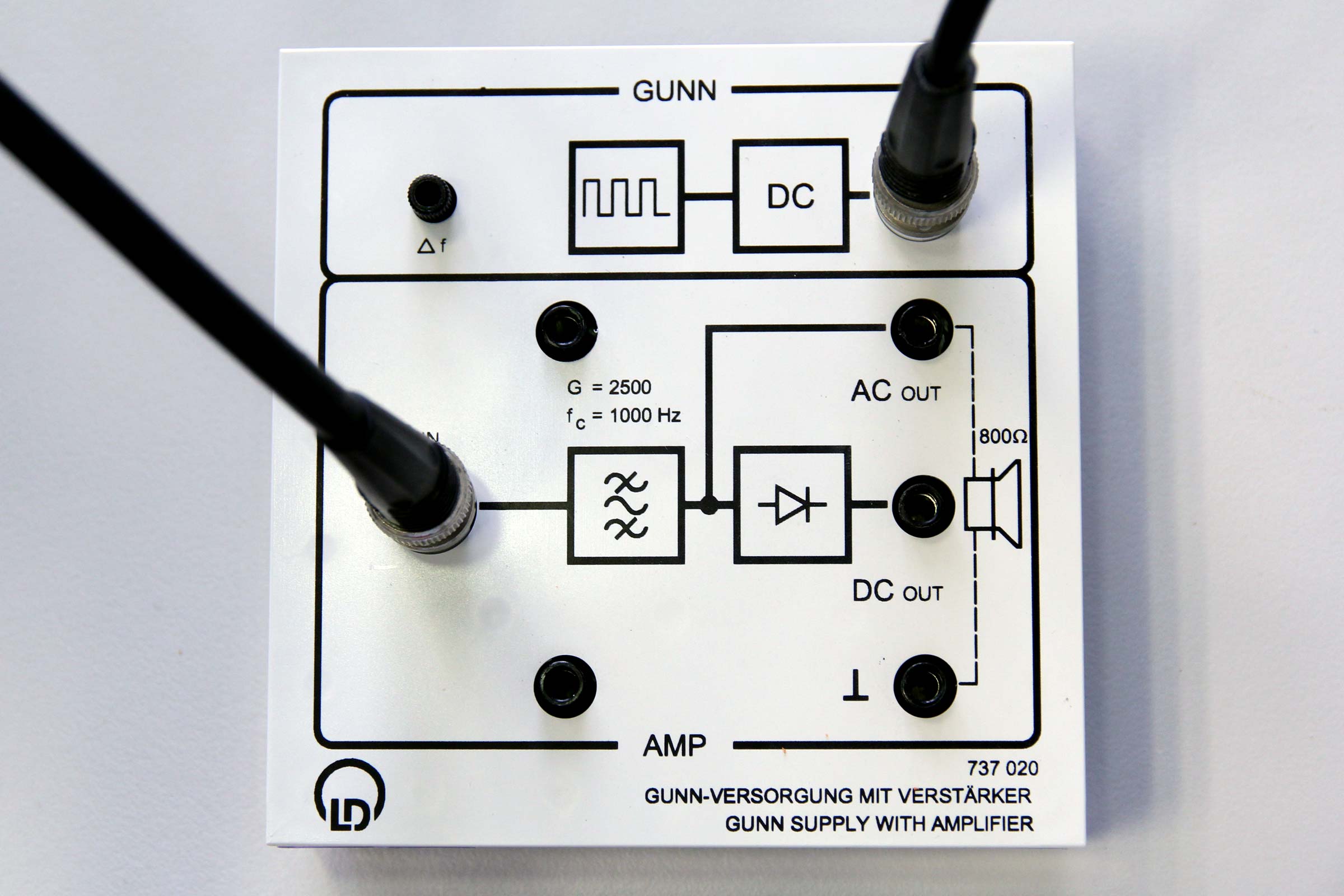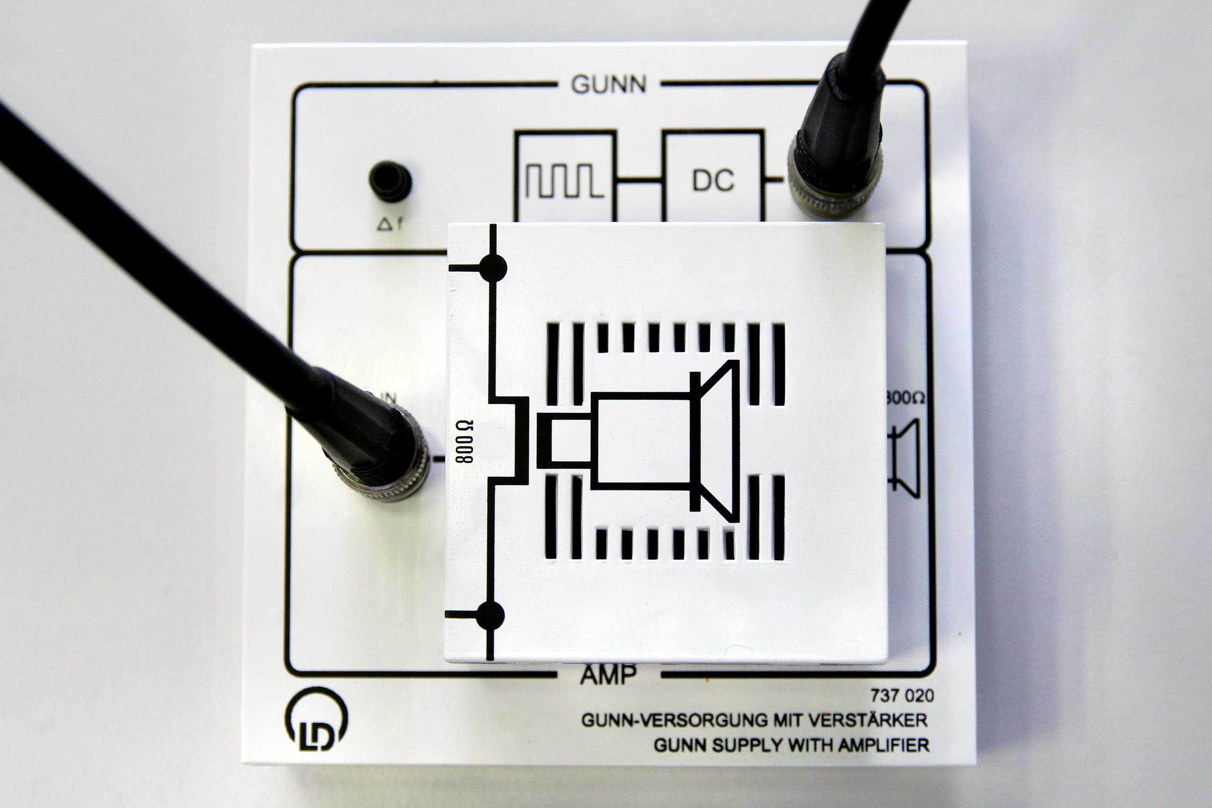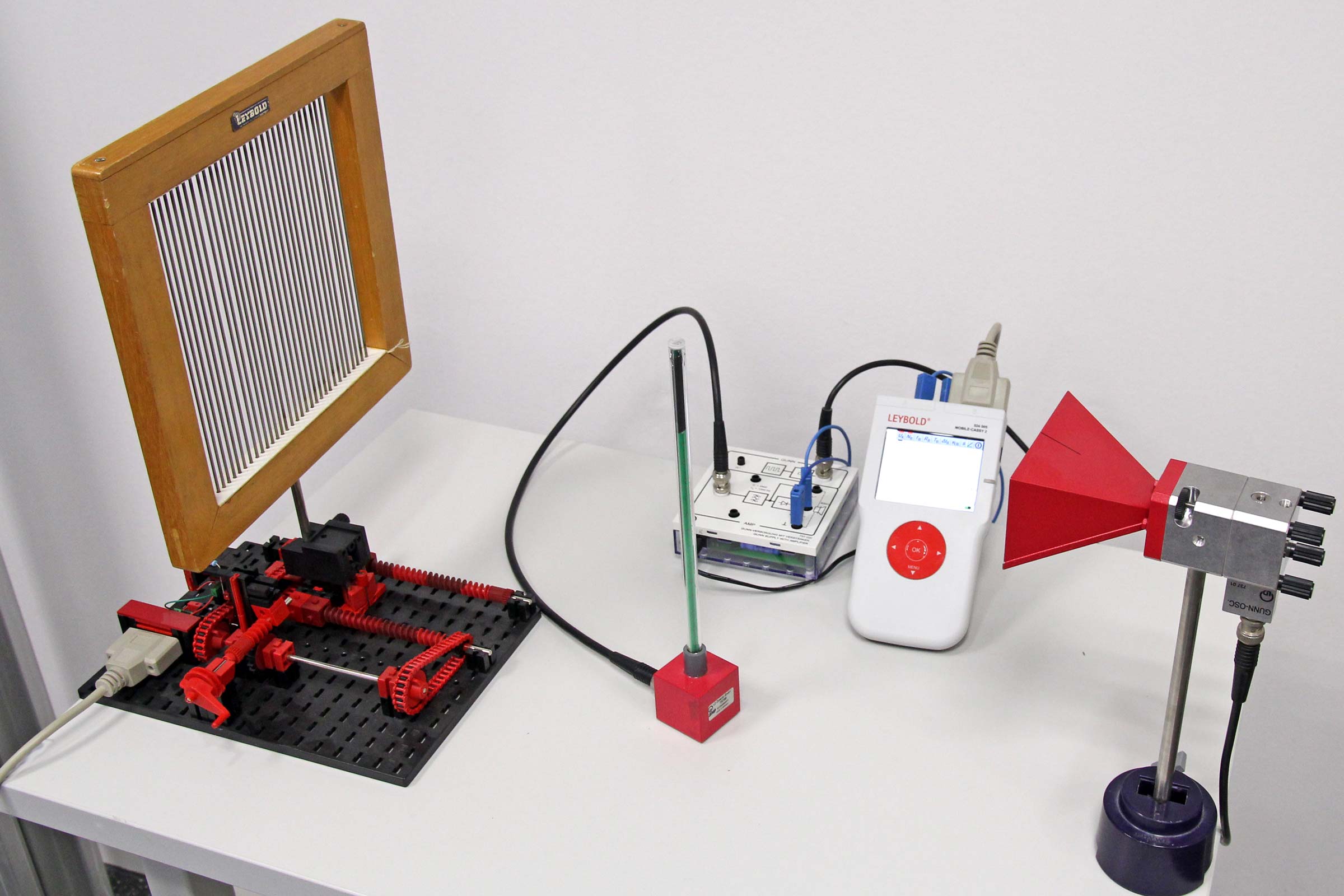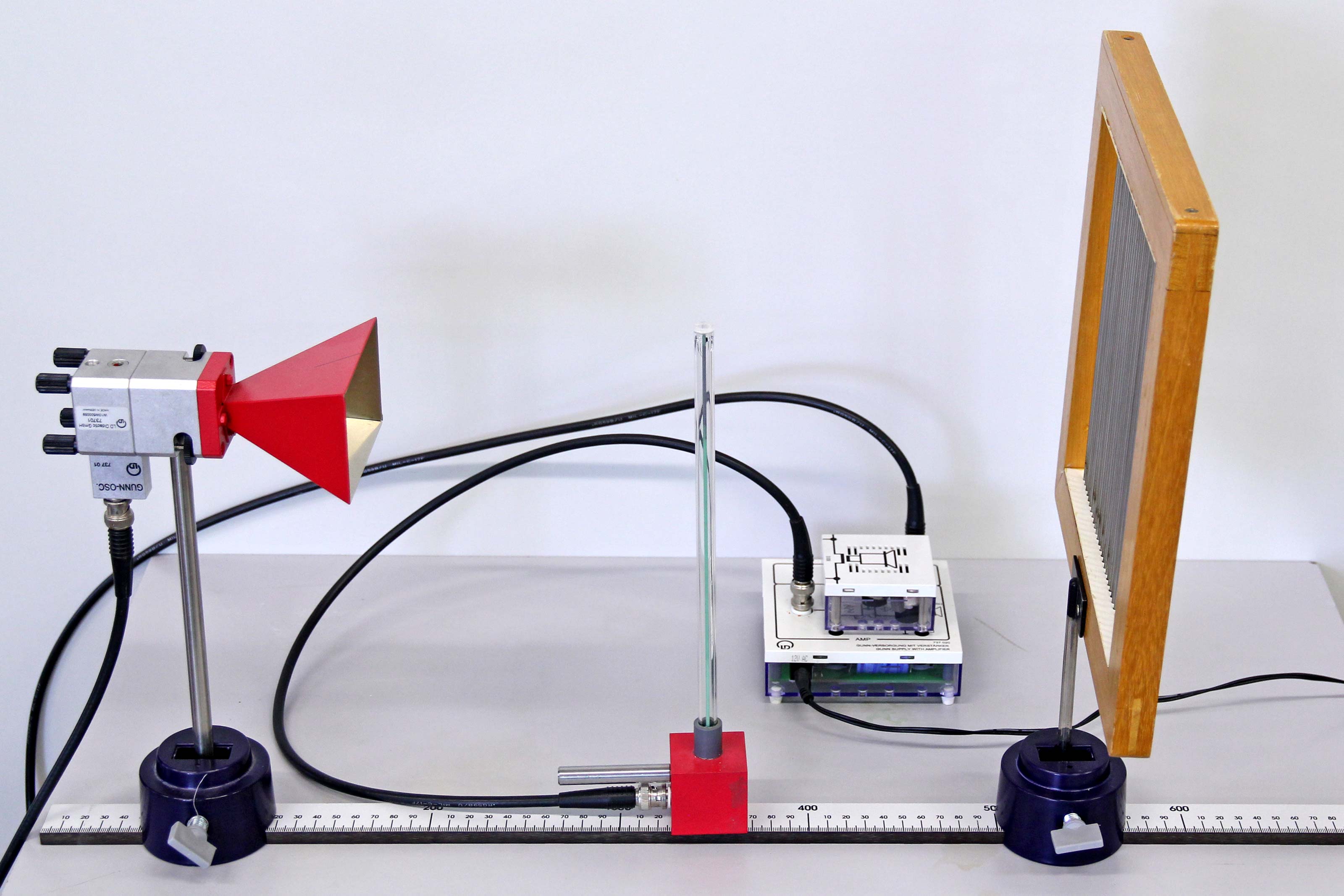Die Mikrowellen werden am Gitter reflektiert. Bei einer Verschiebung des Gitters oder der Empfangsdiode lässt sich in Form von konstruktiver und destruktiver Interferenz eine stehende Welle erkennen. Auf den Verstärker für das emfpangene Signal ist ein Lautsprecher aufgesetzt, sodass die Interefenz akustisch signalisiert wird.