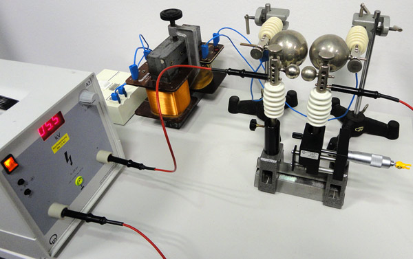 Versuchsaufbau: Die Spannung für die Funkenstrecke A zwischen den großen Kugeln resultiert aus einem an einer schaltbare Steckdose angeschlossenen Aufbautrafo und beträgt ca. 4600 V (500:10.000). Die Spannungsversorgung der kleineren Kugeln (Funkenstrecke B) erfolgt mittels Hochspannungsnetzgerät, welches so eingestellt ist, dass bei dauerhaftem Funkenüberschlag die Spannung auf 5 kV einbricht. Die Kabel der beiden Stromkreise dürfen sich nicht berühren. Die Kugeln der Strecke B ggf. leicht anschmirgeln.