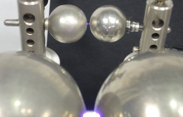 durchsichtiger Kunststoff zwischen den Funkenstrecken. Strecke B im Vordergrund
