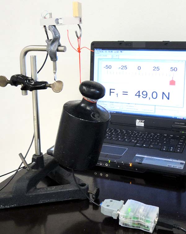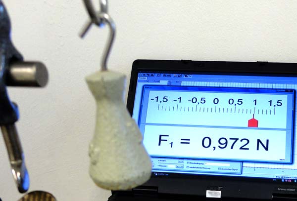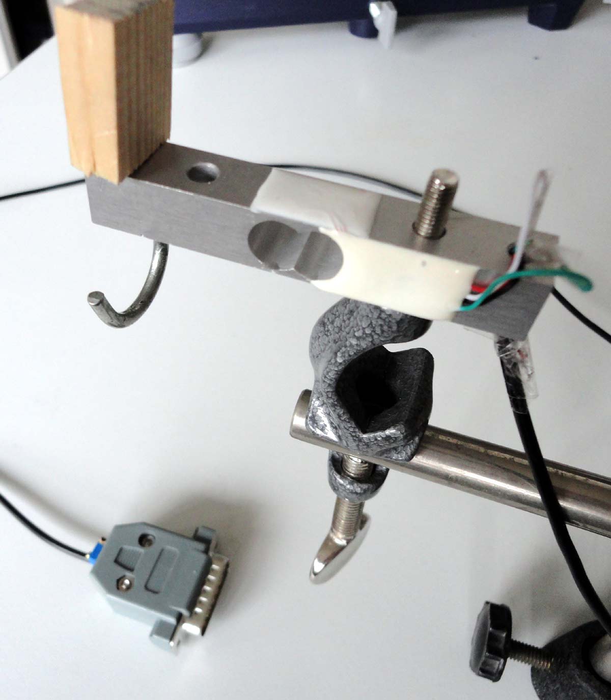 Aus dem Messbalken einer billigen Baumarkt-Küchenwaage (5kg) wird ein Kraftmesser für Cassy gebaut.