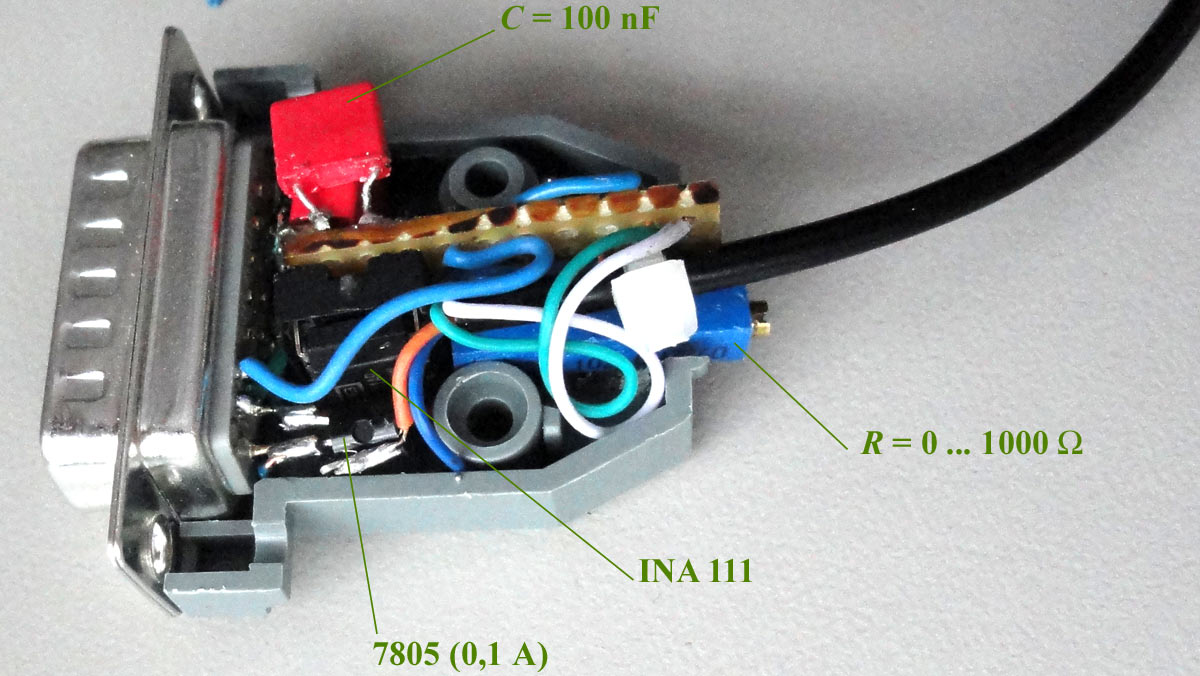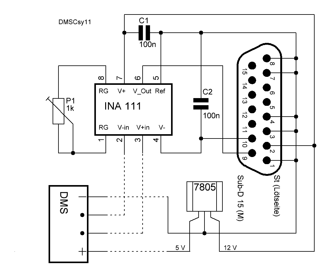 Das Messmodul mit Dehnungsmessstreifen wird aus einer Küchenwaage ausgebaut. Die vier Anschlüsse gehören zu einer Wheatstoneschen Brückenschaltung. Mit ein wenig Ausprobieren lässt sich die Schaltung erschließen. In der Waage wurden die DMS an 6 V betrieben, Cassy stellt 12 V bereit, welche über einen gerade vorhandenen Spannungsregler 7805 auf 5 V reduziert wird. Zur Verstärkung dient ein nicht ganz billiger Instrumentenverstärker (INA 111, INA = Instrumentation Amplifier), dessen Verstärkungsfaktor über einen Trimmer (1kΩ) eingestellt wird.