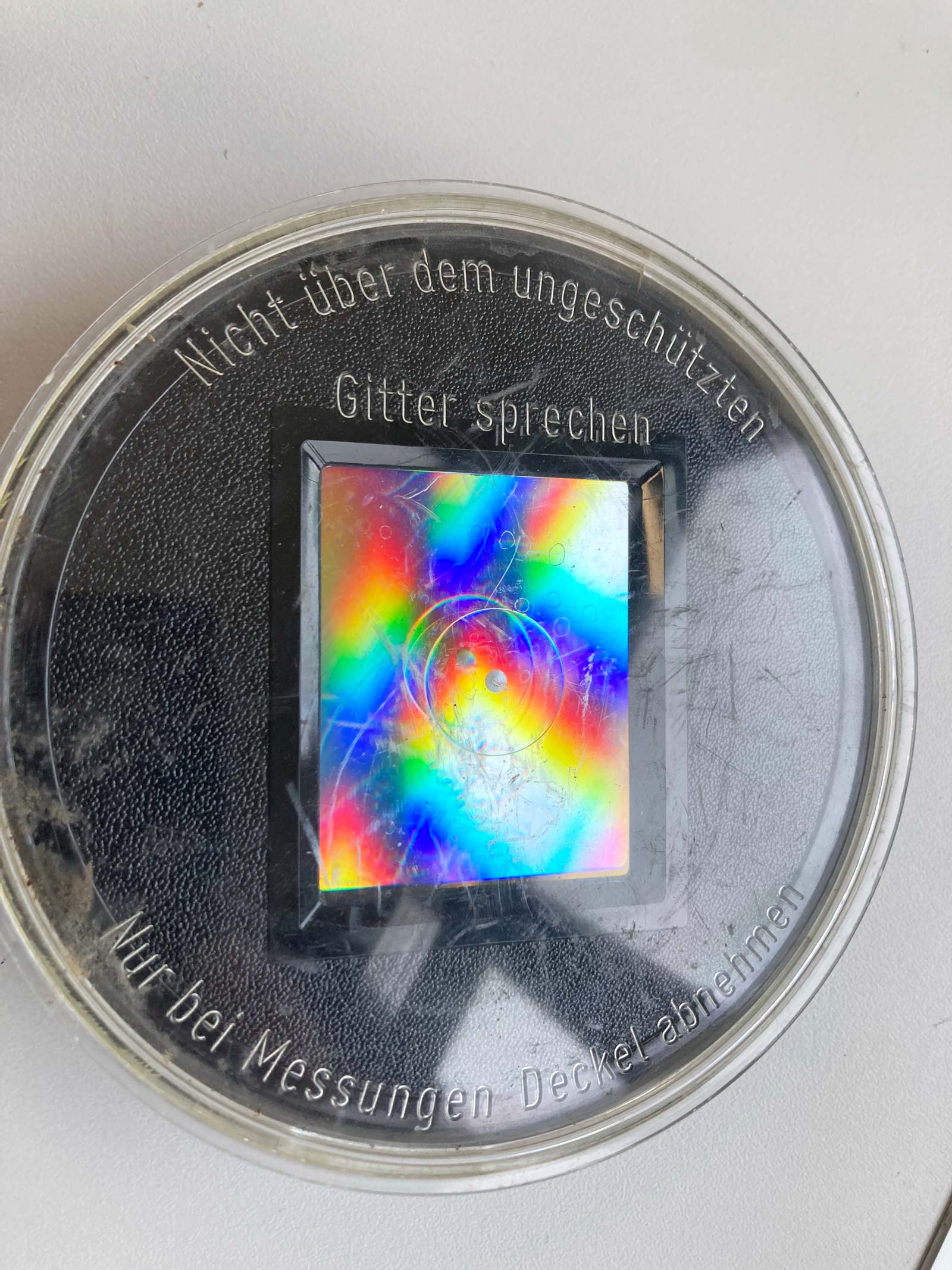 Das Gitter wird als Beugungsgitter verwendet. Es ist in Polystyrol gefaßt. Die Teilungskonstante beträgt 1,5 um, das entspricht 650 Strichen auf 1 mm. Bei einem Betrachtungsausschnitt von 40 mm x 50 mm beträgt die Gesamtstrichzahl etwa 32500. Maße: 116 mm x 150 mm.