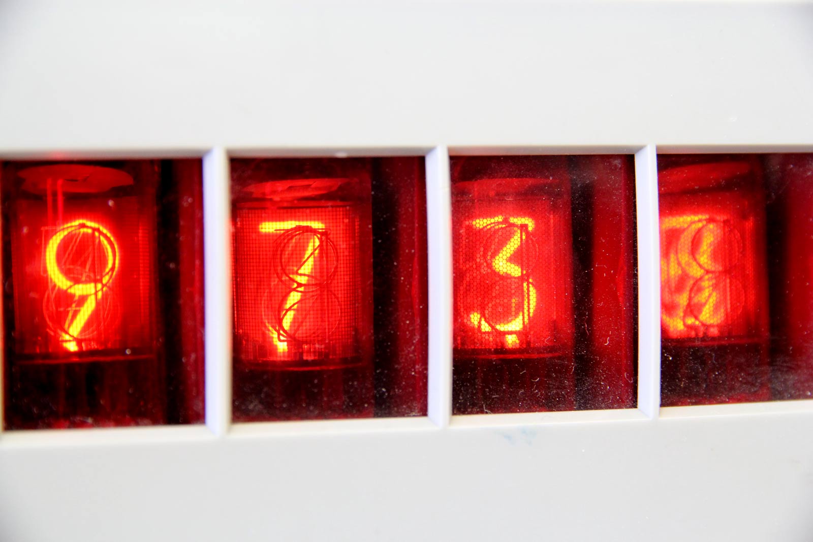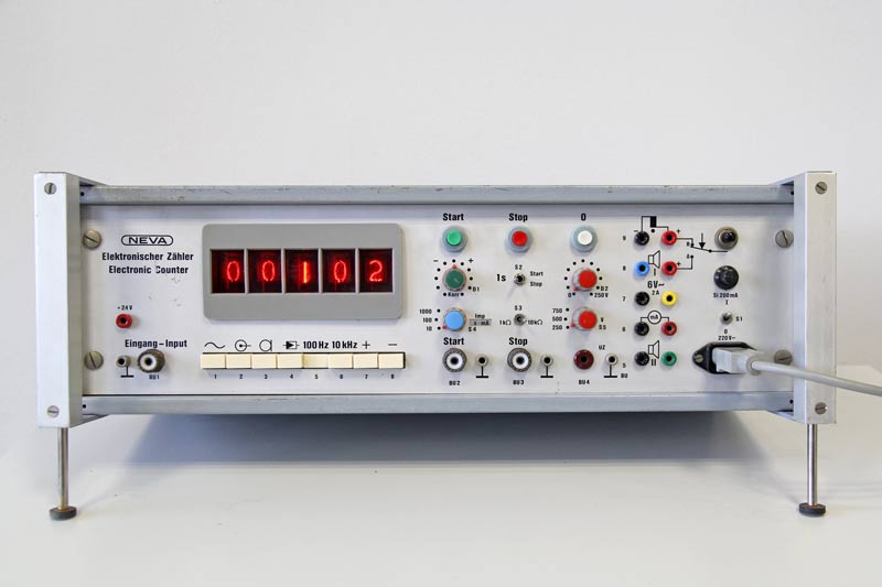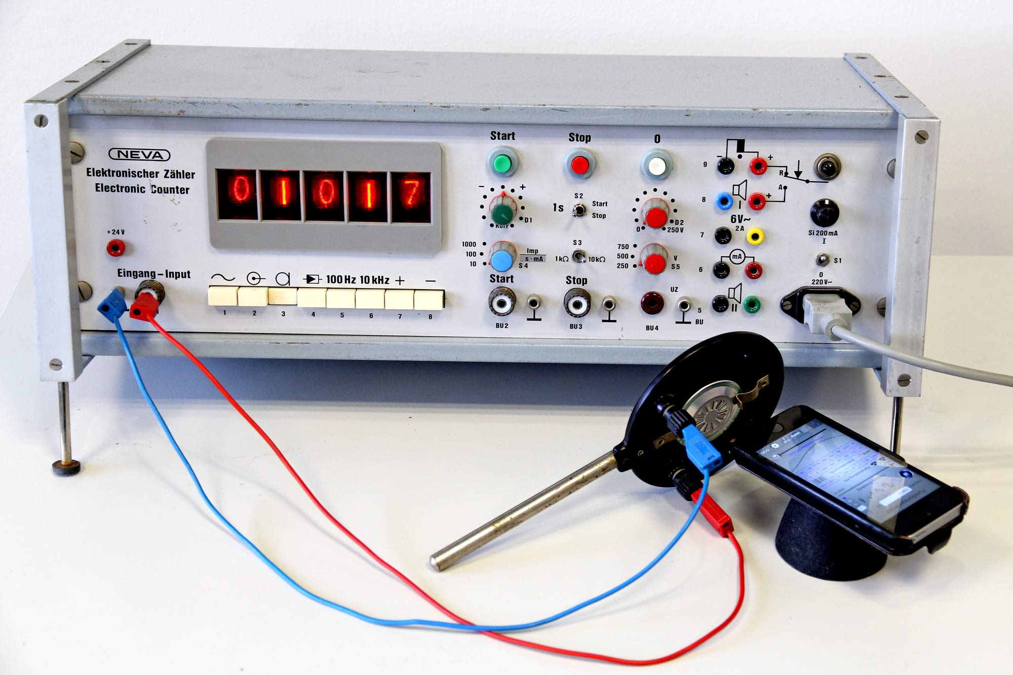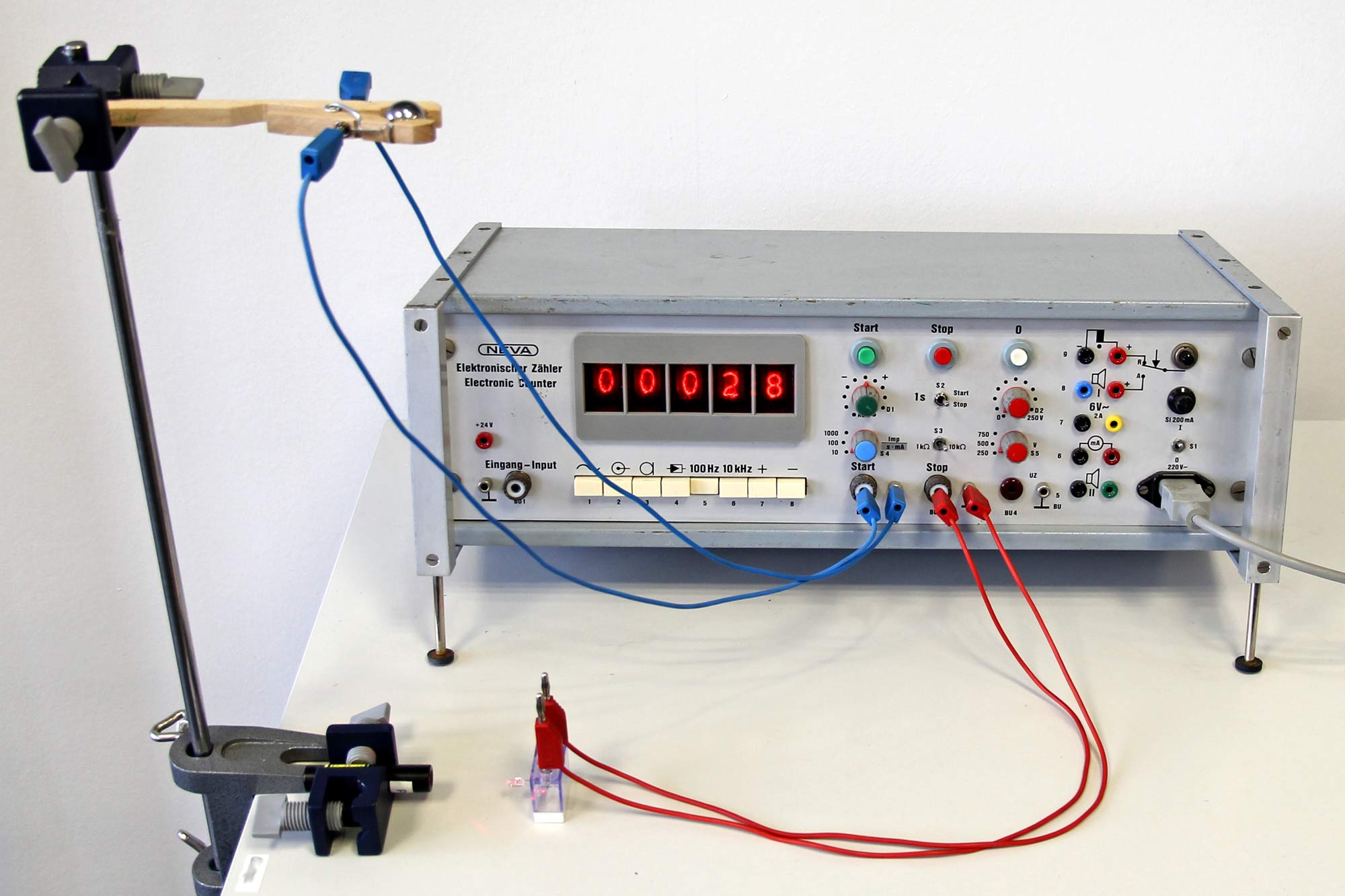 Messung der Fallzeit beim freien Fall mit Kugelauslöseklammer (Phywe) und Lichtschranke aus Laserpointer und Fototransistor SFH 300 3/4. Es wird eine Zeit von 28/100 s angezeigt.
