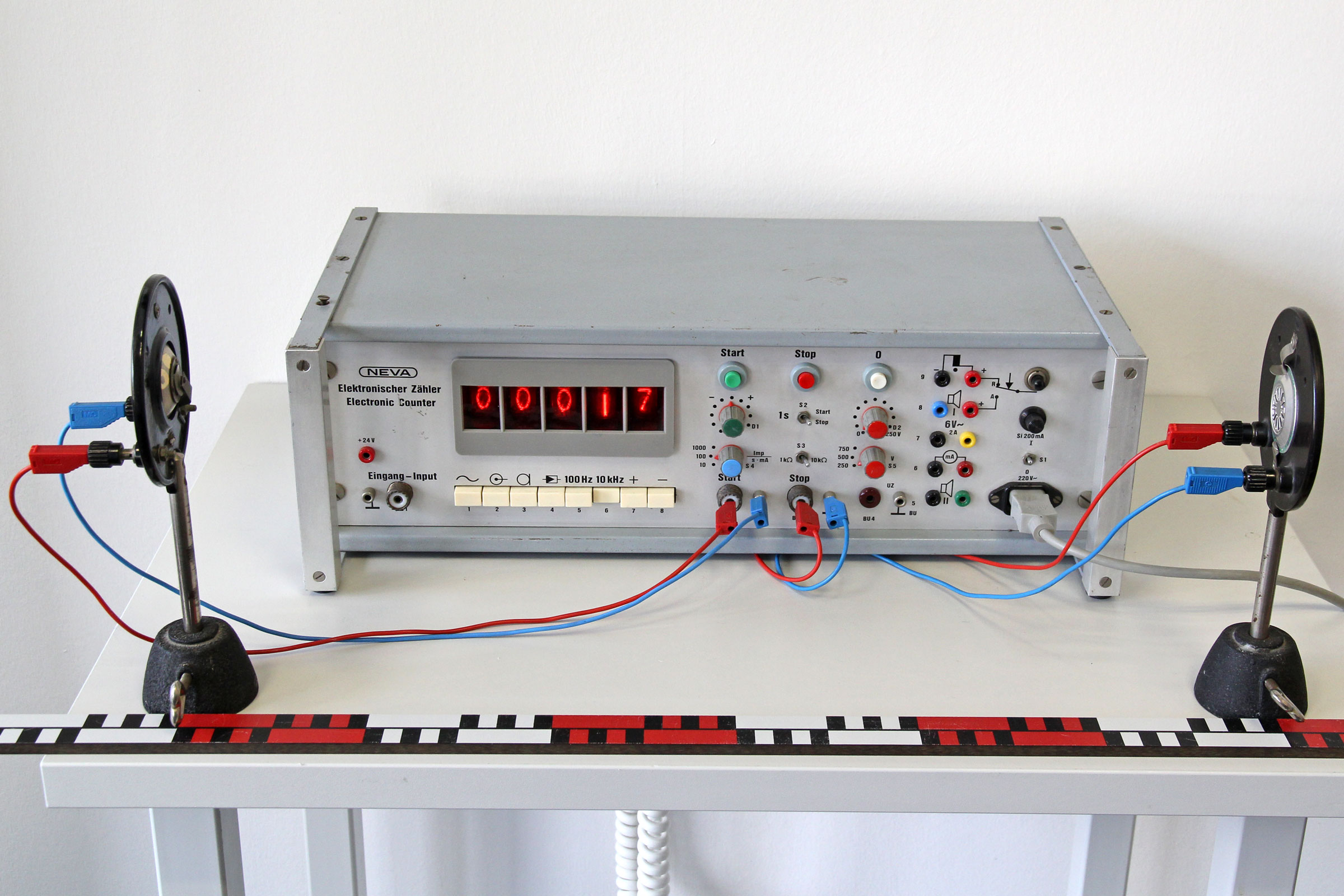 Messung der Schallgeschwindigkeit. Links des linken Mikrofons werden zwei Metallstangen gegeneinander geschlagen. Die angezeigte Laufzeit beträgt 17/10.000 s. Damit ergibt sich eine Schallgeschwindigkeit von c = 0,60 m / (17/10.000 s) = 0,35 km/s.